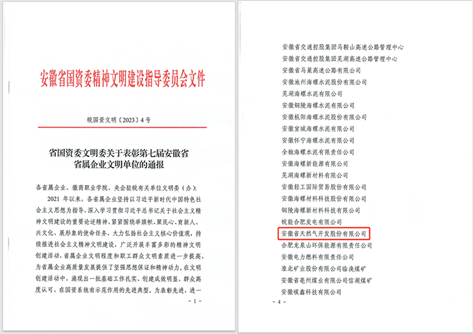 近日,安徽省國資委精神文明建設指導委員會發(fā)布了《省國資委文明委關于表彰第七屆安徽省省屬企業(yè)文明單位的通報》,授予安徽省天然氣開發(fā)股份有限公司第七屆安徽省省屬企業(yè)文明單位榮譽稱號。